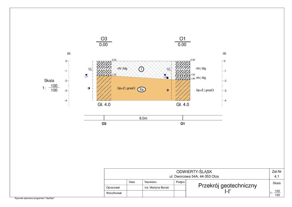 Na prośbę Inwestora wykonano opinię geotechniczną dla potrzeb budowy niepodpiwniczonego budynku mieszkalnego jednorodzinnego. Po zapoznaniu się z terenem badań i materiałami archiwalnymi zadecydowano o wykonaniu 3 odwiertów geotechnicznych do głębokości 4,0 m p.p.t.