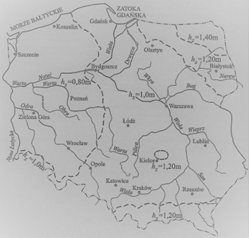 Wartości hz przyjmuje się przy projektowaniu fundamentów obiektów budowlanych, natomiast dla przewodów wodociągowych, kanalizacyjnych lub drenaży, głębokości podane na powyższej mapie należy zwiększyć o co najmniej 1/3.